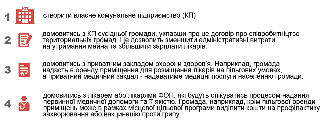 Наведеній перелік варіантів не є вичерпним. Можливе їх поєднання. Так, громада може створити власне КП, а для обслуговування частини населення це КП може укласти договір з лікарем (лікарями) ФОП. В процесі обрання варіанту треба враховувати географічні особливості громади, вік населення та його потреби, а також підготовку адміністративної команди громади.