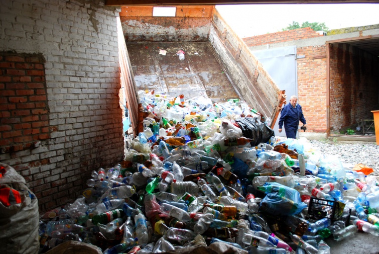 На територію заїжджає вантажівка-самоскид, зупиняється біля одного з павільйонів і гучно висипає вантаж – різнокольорові пластикові пляшки. Працівники жваво відсортовують їх за кольорами.