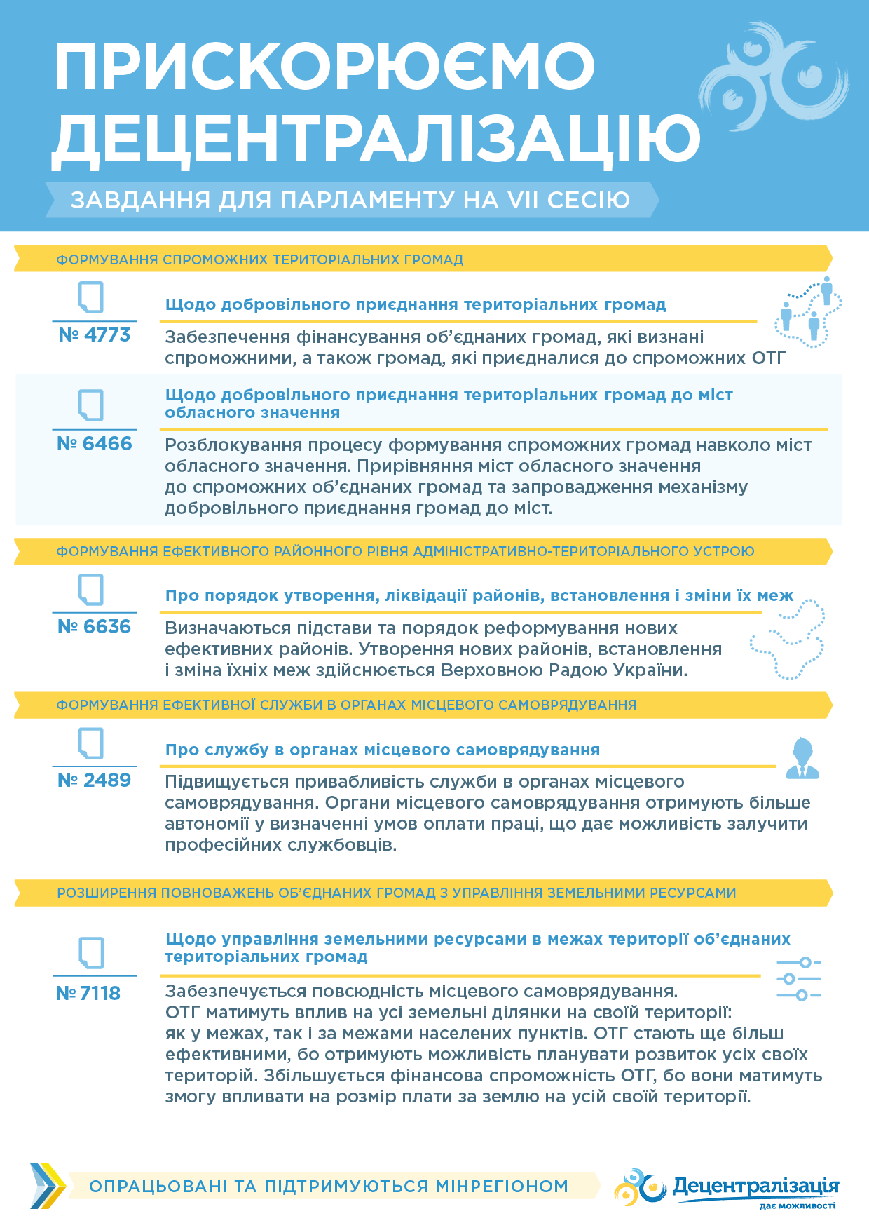 №6636 «Про порядок утворення, ліквідації районів, встановлення і зміни їх меж». У багатьох районах відсутні підстави для спільного представництва інтересів територіальних громад, оскільки ОТГ покривають більшу частину сучасних районів – повноваження передаються до виконавчих органів територіальних громад. Законопроект визначає підстави та порядок реформування нових ефективних районів. Утворення нових районів, встановлення і зміна їх меж здійснюється Верховною Радою України. До проекту розкладу засідань 7-10 листопада не включений.