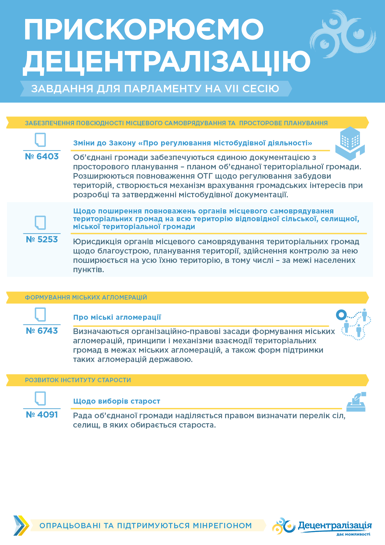 №6403 «Про внесення змін до Закону України «Про регулювання містобудівної діяльності». Неврегульованим залишається питання розробки документації з просторового планування для об’єднаних територіальних громад, до складу яких входять різні населені пункти (від 2 до 50 населених пунктів). Зараз об’єднані територіальні громади не можуть розробляти та затверджувати єдину містобудівну документації для всієї території громад.