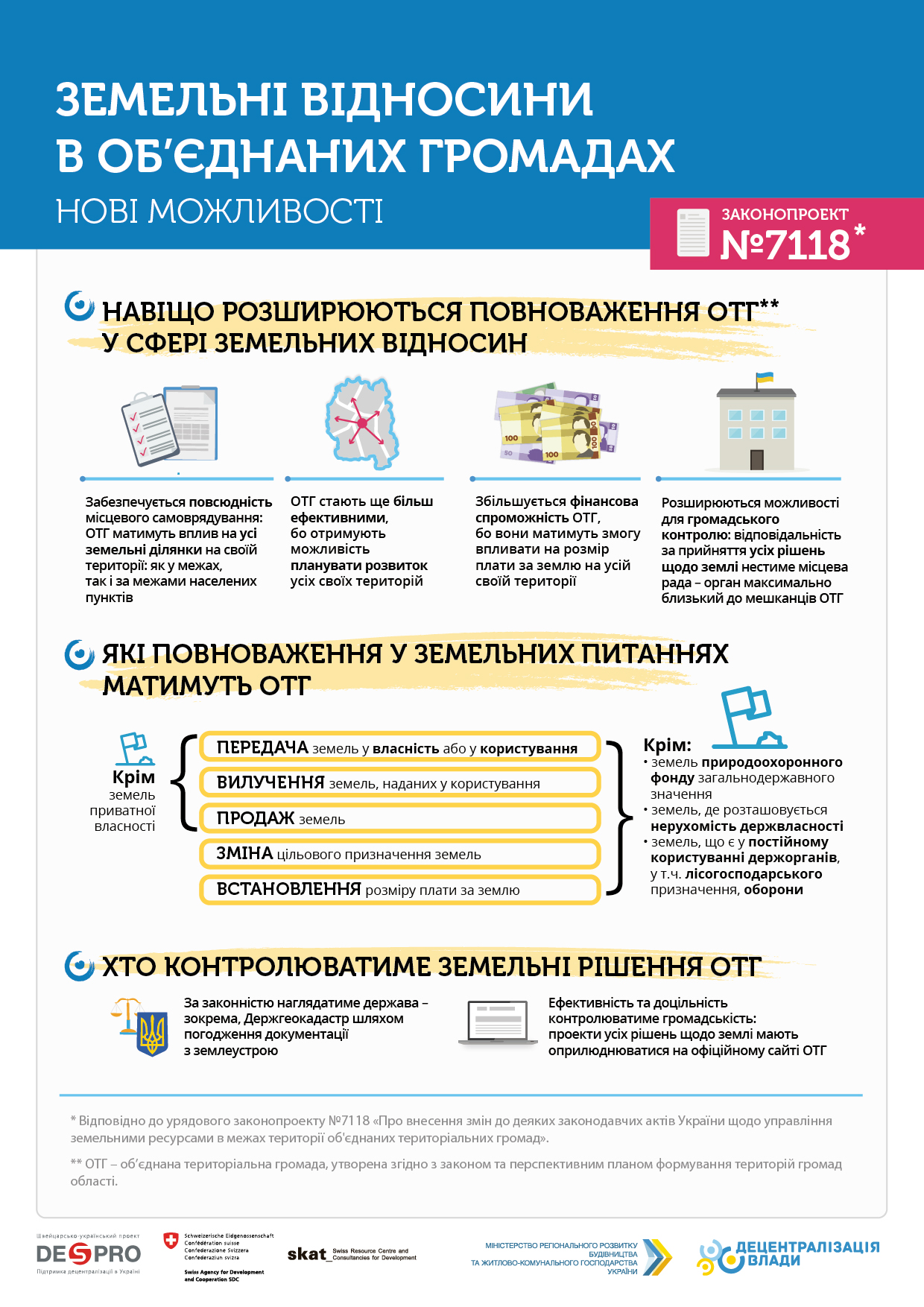 На виконання головного принципу децентралізаційної реформи і забезпечення повсюдності місцевого самоврядування уряд подав до парламенту Законопроект №7118 "Про внесення змін до деяких законодавчих актів України щодо управління земельними ресурсами в межах території об'єднаних територіальних громад".