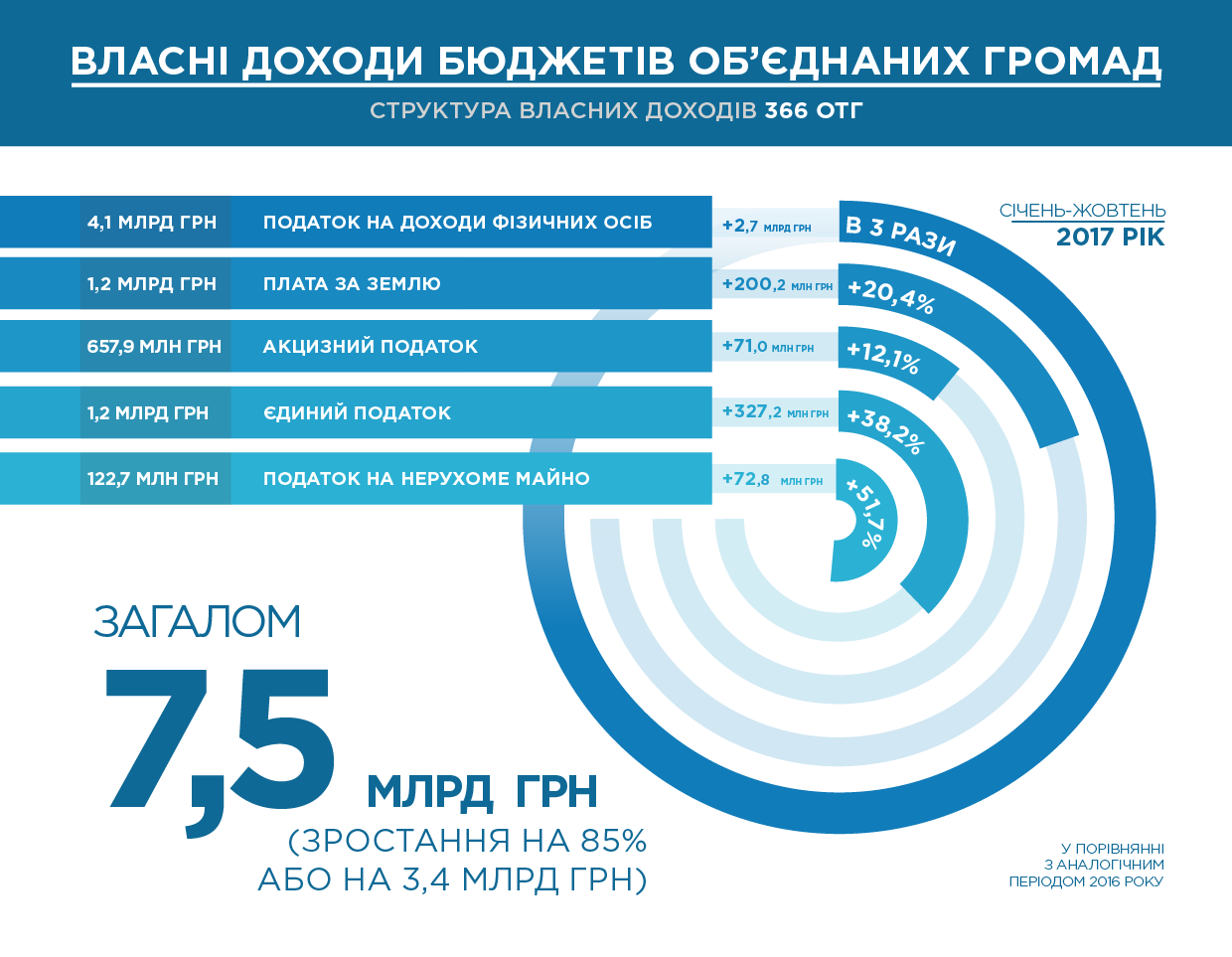 Власні доходи місцевих бюджетів 366-ти об’єднаних територіальних громад (ОТГ) зросли на 85 % та склали 7,5 млрд грн. Приріст склав +3,4 млрд грн. Про це повідомила Яніна Казюк, координатор з фінансової децентралізації Центрального офісу реформ при Мінрегіоні (за підтримки програми U-LEAD). Дані відображають стан виконання місцевих бюджетів за 10 місяців 2017 року.