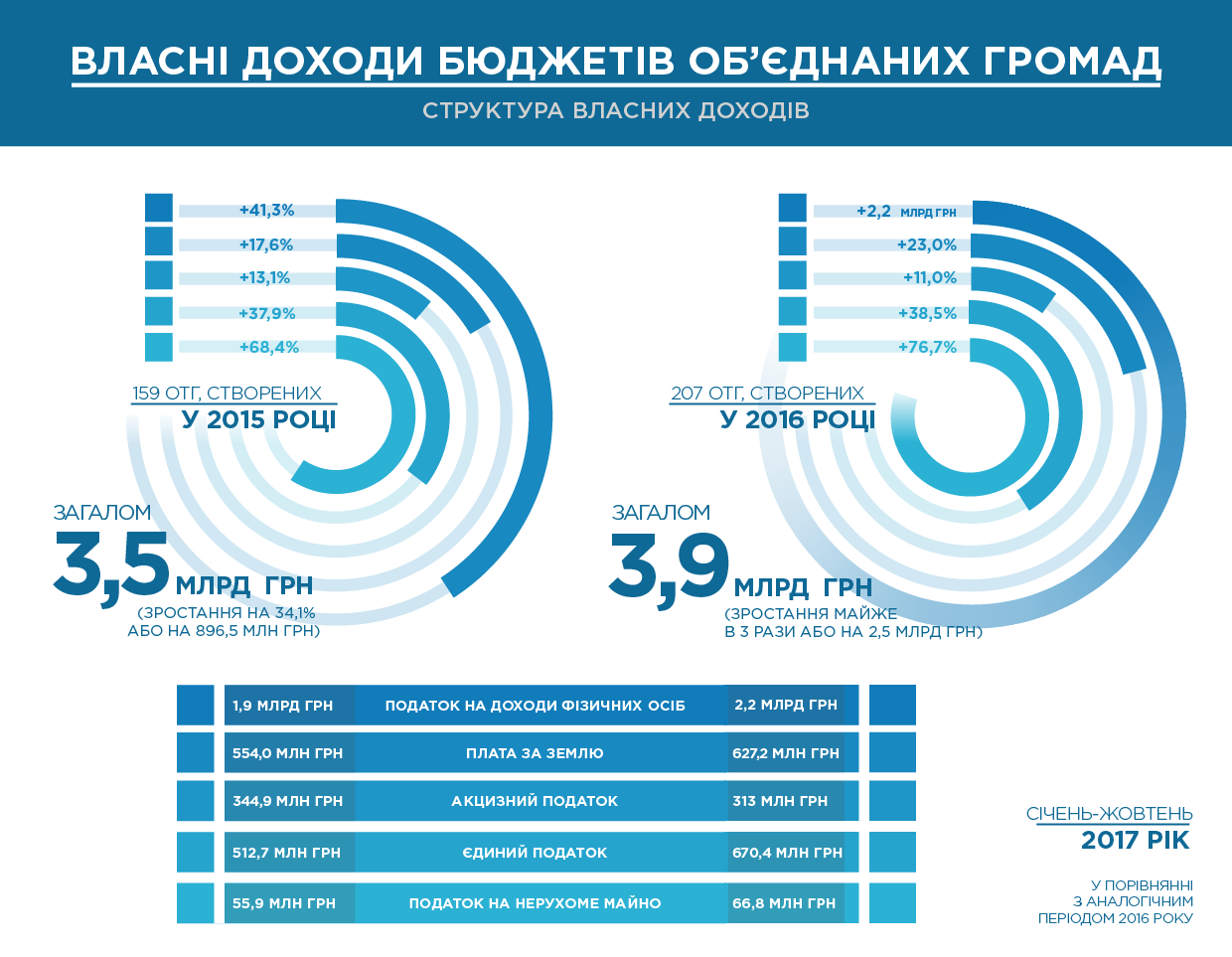 Так, 207 ОТГ, у яких перші місцеві вибори відбулися в 2016 році, тільки в цьому році отримали 60% надходжень від податку на доходи фізичних осіб до свої місцевих бюджетів. За 10 місяців цього року їх власні ресурси, у порівнянні з аналогічним періодом минулого року, зросли майже в 3 рази та склали 3,9 млрд грн (+2,5 млрд грн).