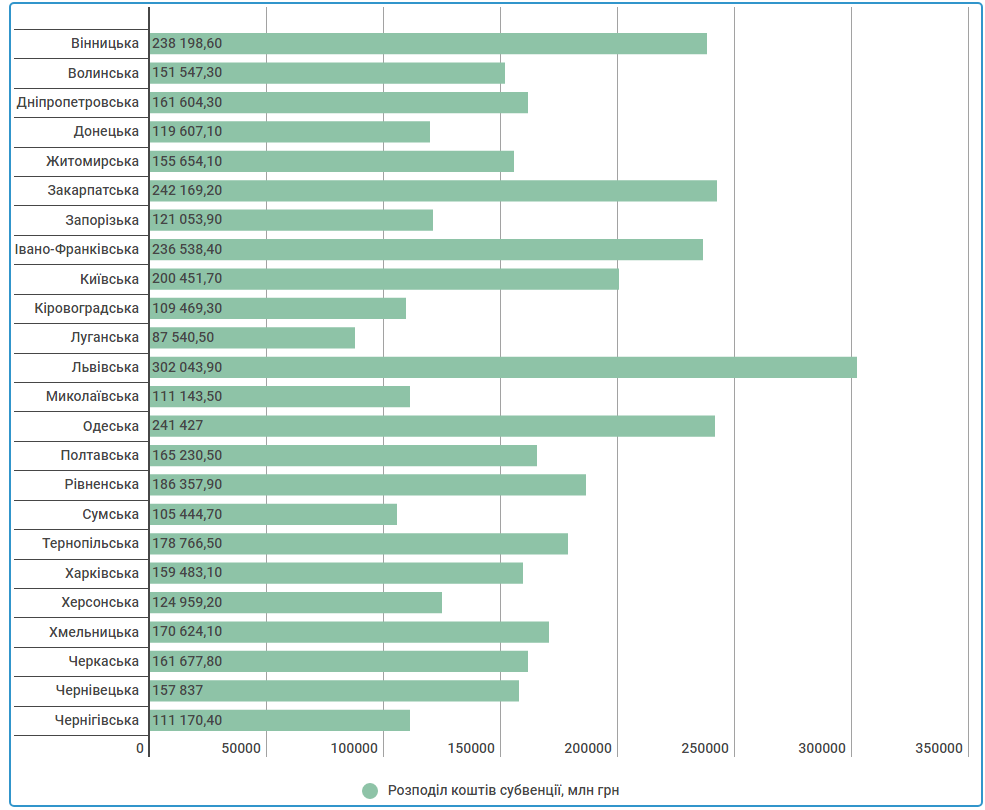 Розподіл коштів субвенції між областями виглядає так: