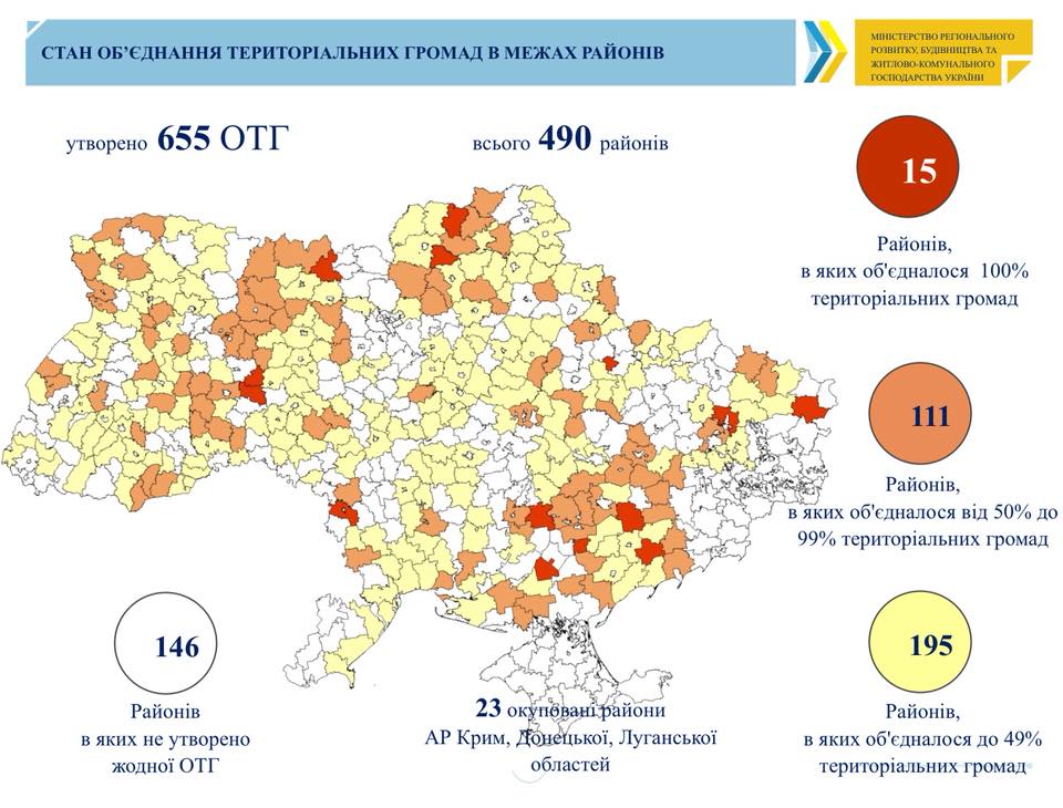 У 146 районах із 490 не створено жодної об’єднаної територіальної громади. Про це на своїй сторінці у Facebook написав В’ячеслав Негода, перший заступник Міністра регіонального розвитку, будівництва та ЖКГ.