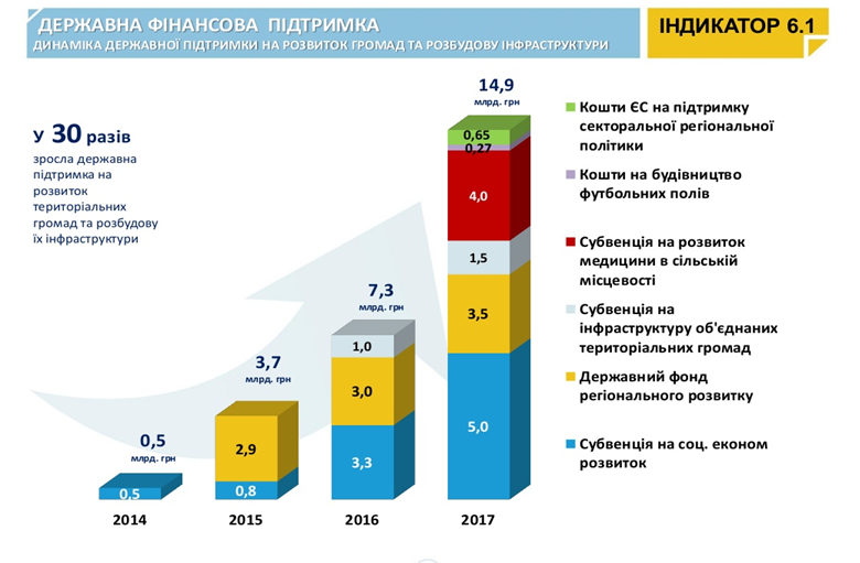 «Загалом у 2017 році в державному бюджеті було передбачено для фінансування проектів регіонального та місцевого значення майже 15 мільярдів гривень для того, аби місцева влада змогла вирішувати питання інфраструктури. Це суттєва підтримка. Для порівняння, у 2014 році всього півмільярда було спрямовано на соціально-економічний розвиток. Ситуація докорінно почала змінюватися з 2015 року - це рік, коли Уряд впровадив перший етап фінансової децентралізації. З того часу зростає наповнення місцевих бюджетів і державна фінансова підтримка на розвиток територіальних громад та розбудову їх інфраструктури», - сказав перший заступник Міністра регіонального розвитку, будівництва та ЖКГ В’ячеслав Негода.