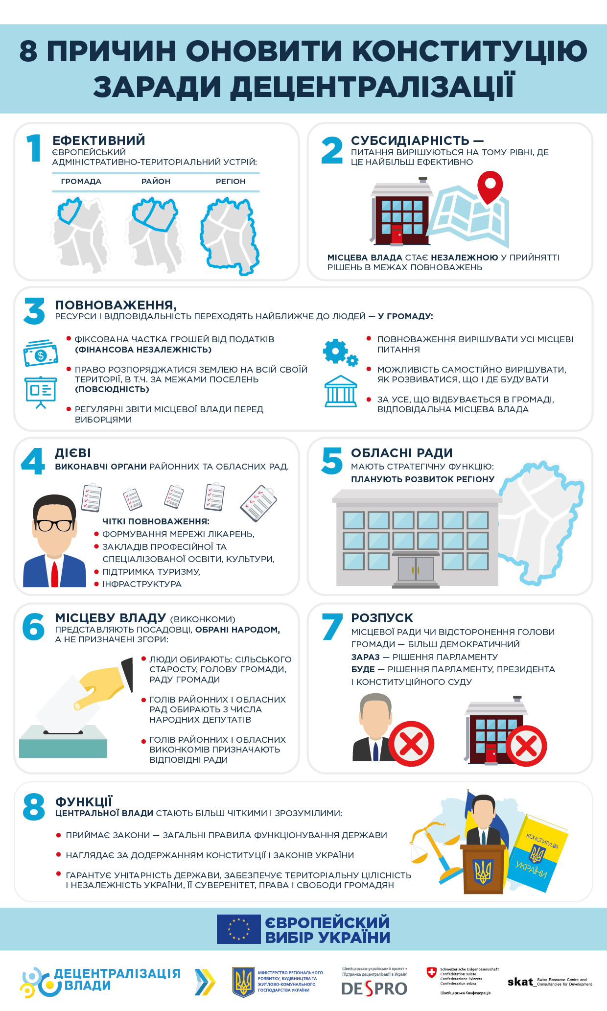 Інфографіка розроблена на основі прийнятого Верховною Радою у першому читанні Проекту Закону «Про внесення змін до Конституції України (щодо децентралізації влади).