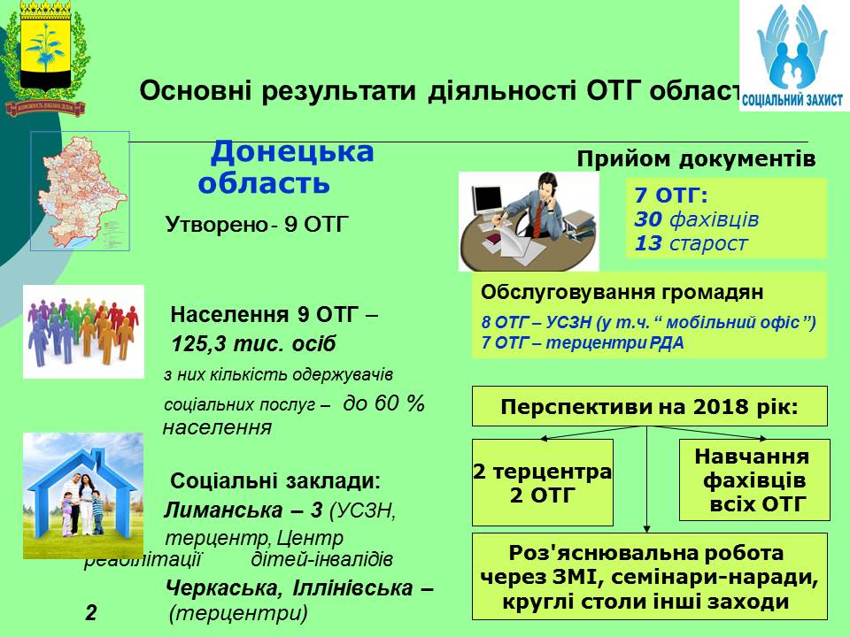 Загалом у Донецькій області в сфері соціального захисту населення об’єднаних громад відбулись позитивні зміни. «Сервіс прийому жителів громад наближено до людини: забезпечено прийом документів для призначення різних видів соціальної допомоги, створено структурні підрозділи соціального захисту населення, відкриваються територіальні центри, кількість користувачів соціальних послуг не зменшилась, а професійний рівень фахівців громади поступово зростає», - зазначає Олена Бойко, завідувач сектору моніторингу впровадження процесів децентралізації в сфері соціального захисту.