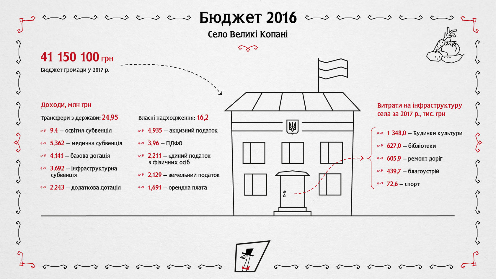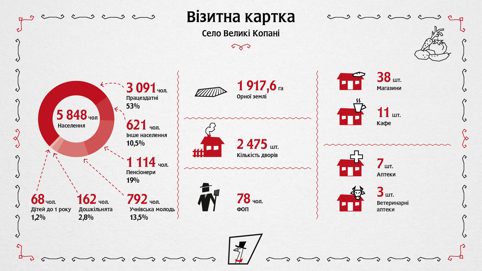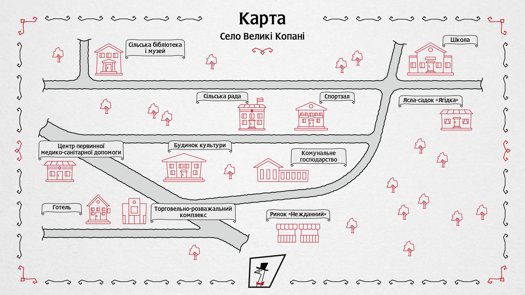 Щоб це дізнатися, Сільський Ревізор завітав у сільську раду, побував у кожному класі школи, зазирнув у дитсадок, приміряв костюм інопланетянина в будинку культури, подружився із котом-лікарем у місцевому Центрі первинної медико-санітарної допомоги. Ще ми розпитали про всі особливості тепличного виробництва овочів, дізналися, по чому яблука на ринку «Нежданний», відвідали голубину ферму і побігали з мікрофоном за фазанами. Усі об'єкти інфраструктури, де ступала нога Гусака-ревізора, зображені на карті.