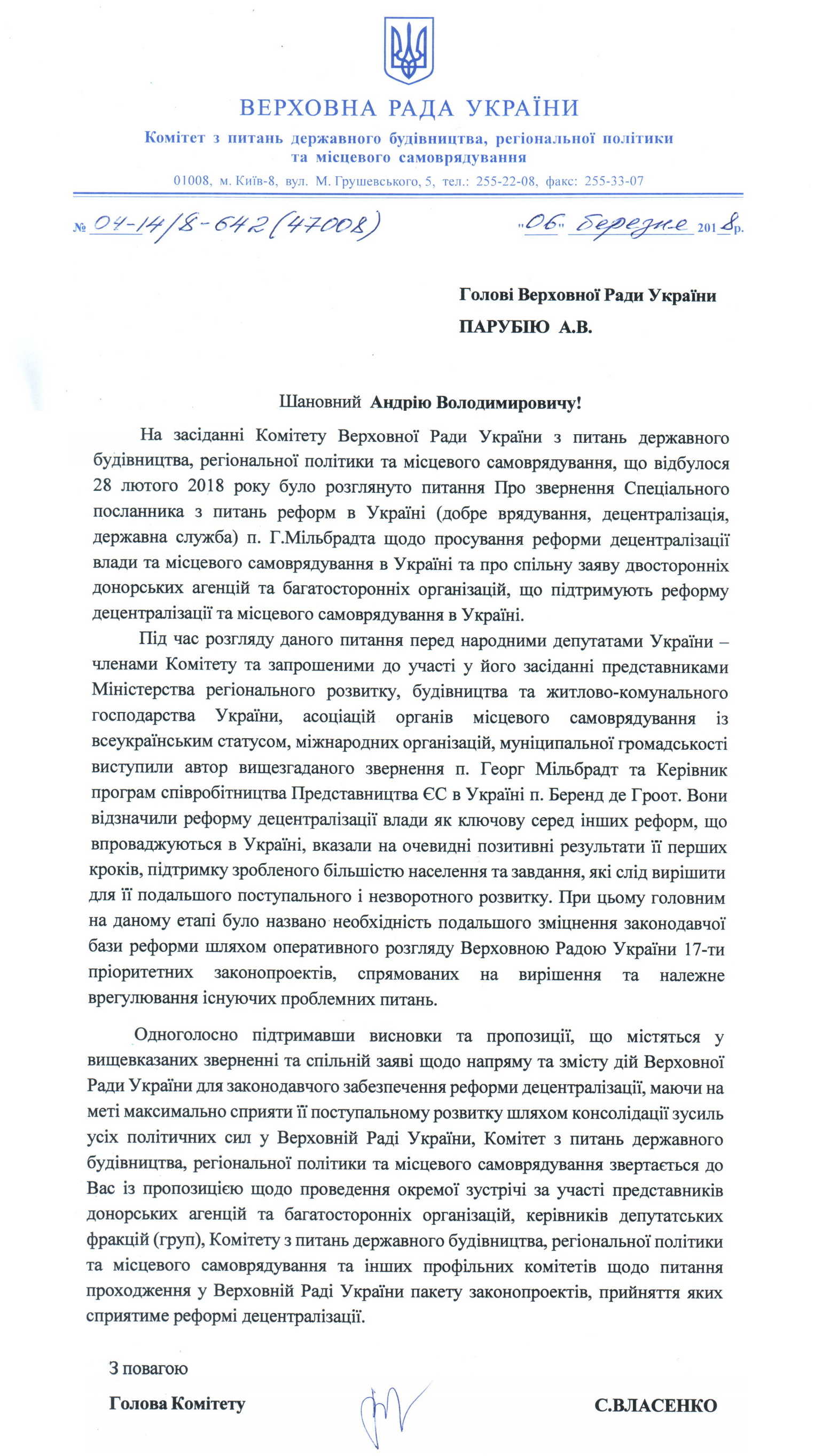 Парламентський комітет з питань державного будівництва, регіональної політики та місцевого самоврядування звернувся до Голови Верховної Ради України Андрія Парубія з пропозицією щодо проведення окремої зустрічі за участі представників донорських агенцій та багатосторонніх організацій, керівників депутатських фракцій (груп), профільних парламентських комітетів щодо питання проходження у Верховній Раді України пакету законопроектів, прийняття яких сприятиме реформі децентралізації: