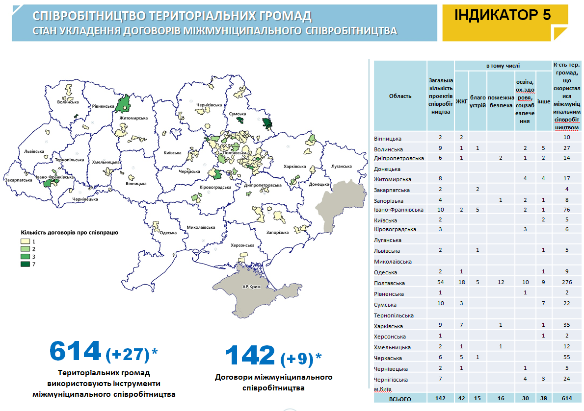 Лише за минулий місяць 27 територіальних громад уклали 9 договорів про співробітництво. Всього таким інструментом скористалися 614 громад, які уклали між собою 142 договори і тепер спільно, об’єднавши ресурси, вирішують питання житлово-комунального господарства, благоустрою, пожежної безпеки, соціального забезпечення та інші.