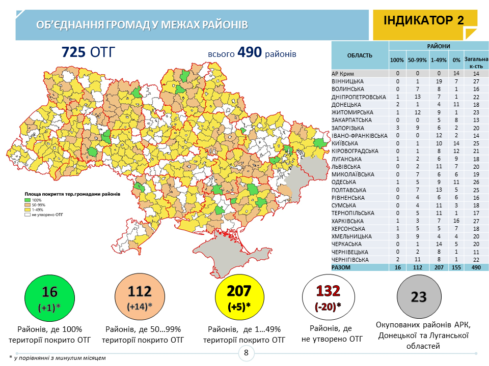 На один район стало більше серед тих, території яких повністю покриті об’єднаними територіальними громадами. Тепер їх 16. Районів, території яких покриті об’єднаними територіальними громадами від 50% до 99%, налічується 112, від 1% до 49% - 207.