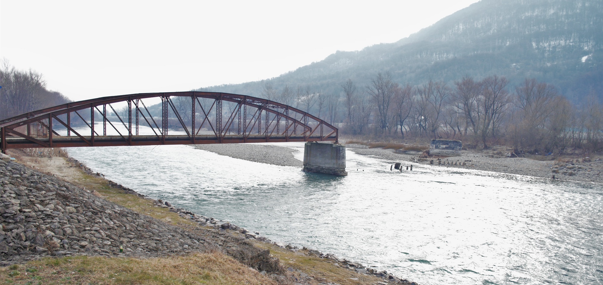 На дамбі – невеличкий пункт спостереження за рівнем води у ріці, а поруч – український прикордонний стовп. За ним – міст, брукований ще давньою австрійською бруківкою. Вхід на нього закритий металевими ґратами. Хоча загалом іти нікуди: замість другого прольоту моста зіяє порожнеча.