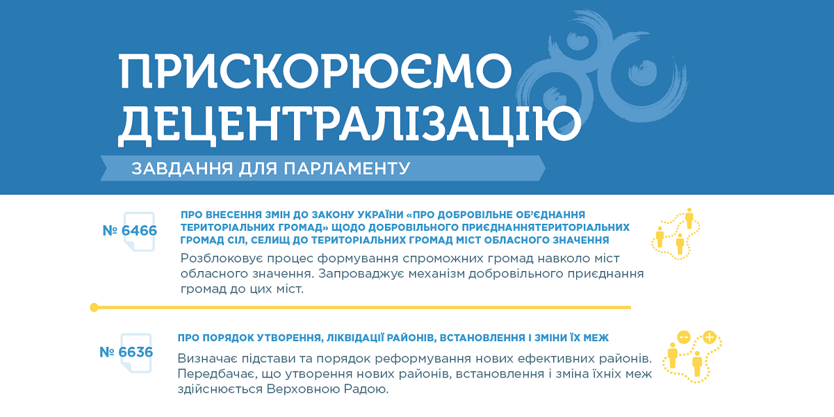 Проект закону № 6466 про внесення змін до Закону України «Про добровільне об’єднання територіальних громад» надає можливість територіальним громадам приєднуватися до міст обласного значення без проведення перших виборів на всій території ОТГ. Ухвалення законопроекту очікують 182 міста обласного значення, навколо яких можуть бути утворені нові ОТГ.