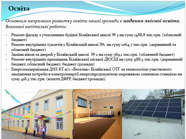 Звісно, питання соцзахисту, освіти, медицини, культури, спорту перебувають у фокусі постійної уваги ОТГ. Це і ремонти приміщень, і придбання обладнання, і залучення ініціатив громадян до змін, адже девіз Біляївської ОТГ: «Ти не один».