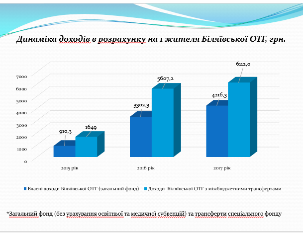 У 2016 та у 2017 роках, за даними незалежних фінансових моніторингів, Біляївська ОТГ посідала лідерські позиції не лише в Одеській області, а в Україні. З об’єднанням громади доходи на одного мешканця виросли з 910,3 грн у 2015 році ОТГ до 4216,3 грн у 2018.