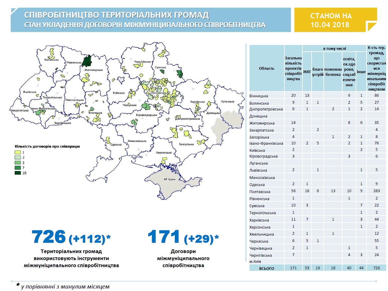 Більше сотні територіальних громад у минулому місяці скористалися інструментом співробітництва громад. Вже 726 громад активно співпрацюють у різних сферах. Лідером у міжмуніципальному співробітництві залишається Полтавська область, де близько 300 громад спільно вирішують питання переважно у сферах житлово-комунального господарства, пожежної безпеки, освіти, охорони здоров’я. Про це свідчать дані Моніторингу процесу децентралізації влади та реформування місцевого самоврядування (ПЕРЕГЛЯНУТИ), підготовленого Мінрегіоном. Дані відображені станом на 10 квітня 2018 року.