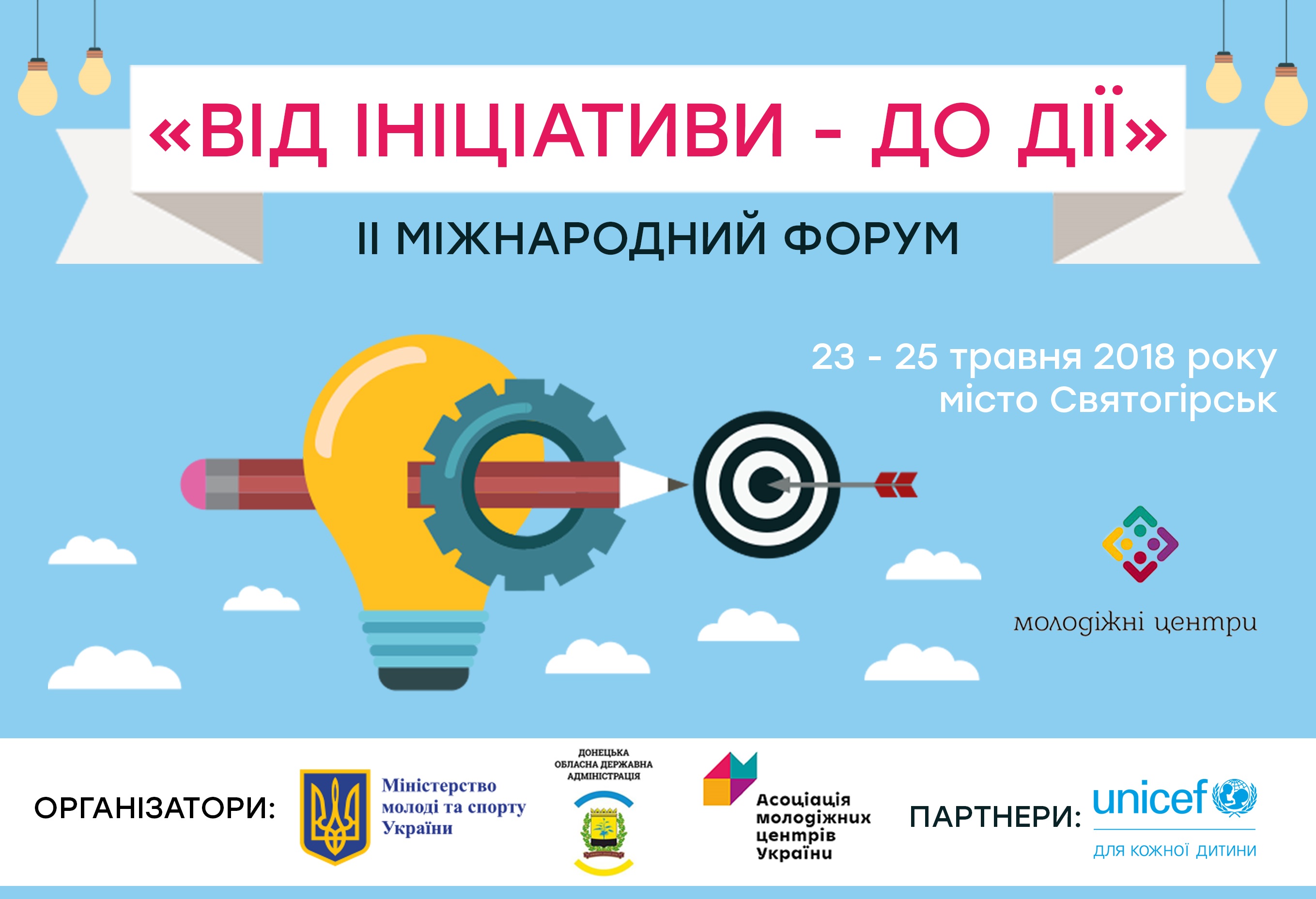 23 – 25 травня 2018 року в місті Святогірську на Донеччині Міністерство молоді та спорту України в партнерстві з Донецькою обласною держадміністрацією, Асоціацією молодіжних центрів України та за підтримки Дитячого фонду ООН (ЮНІСЕФ) в Україні проводитимуть другий Міжнародний форум молодіжних центрів «Від ініціативи – до дії».