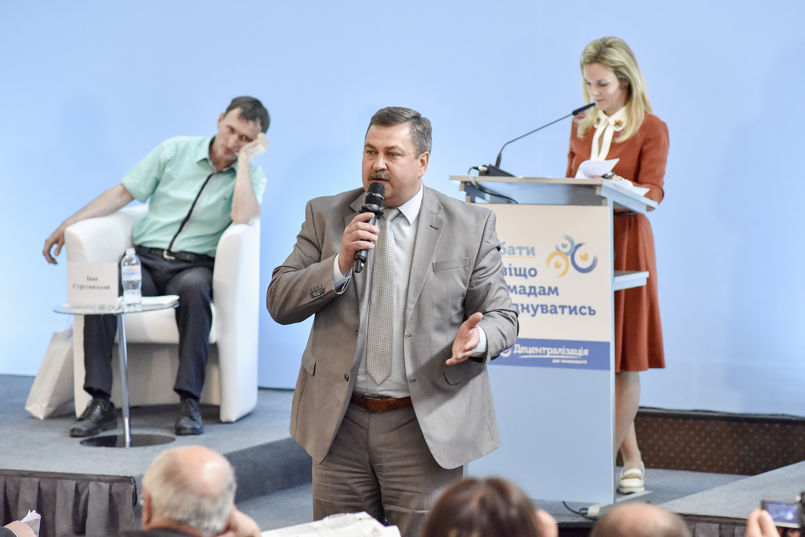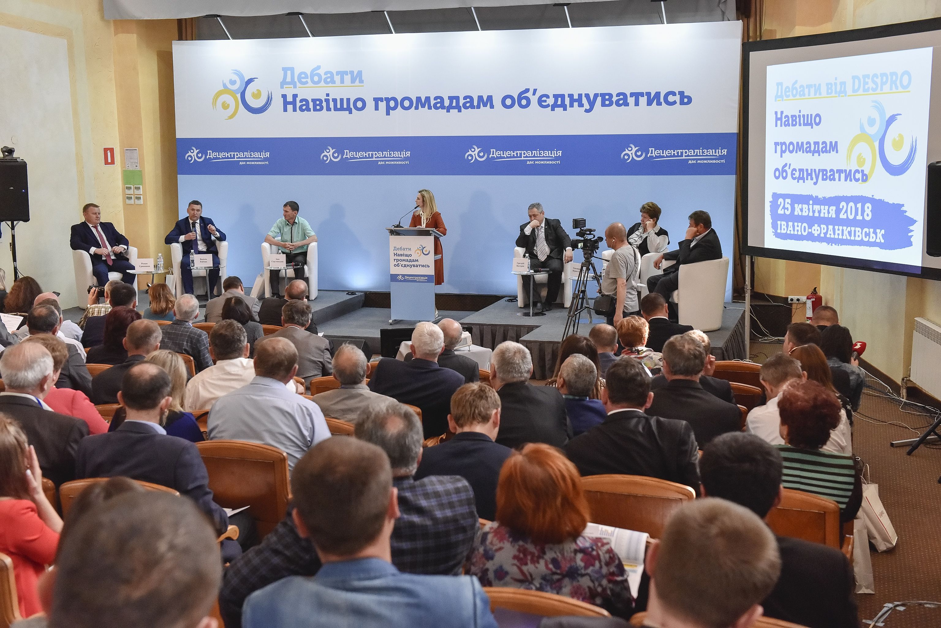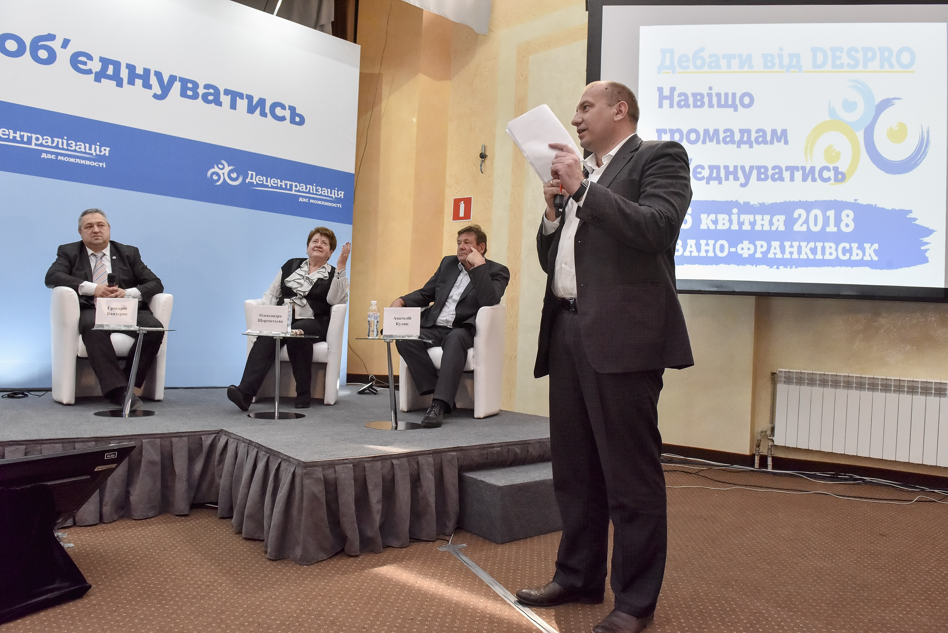 На стороні «ПРОТИ» також виступав Ясенево-Пільнівський сільський голова (Городенківський район) Іван Струтинський, а на стороні «ЗА» – голова Байковецької ОТГ Тернопільської області Анатолій Кулик. Організатором заходу виступив Швейцарсько-український проект «Підтримка децентралізації в Україні» DESPRO за сприяння Міністерства регіонального розвитку, будівництва та житлово-комунального господарства України, Івано-Франківської обласної державної адміністрації та Івано-Франківського Центру розвитку місцевого самоврядування, створеного за підтримки Програми «U-LEAD з Європою». Це треті дебати, проведені DESPRO. Про те, чи варто громадам об’єднуватися, раніше вже сперечалися у селищі Краснокутськ Харківської області та у місті Жовква Львівської області.