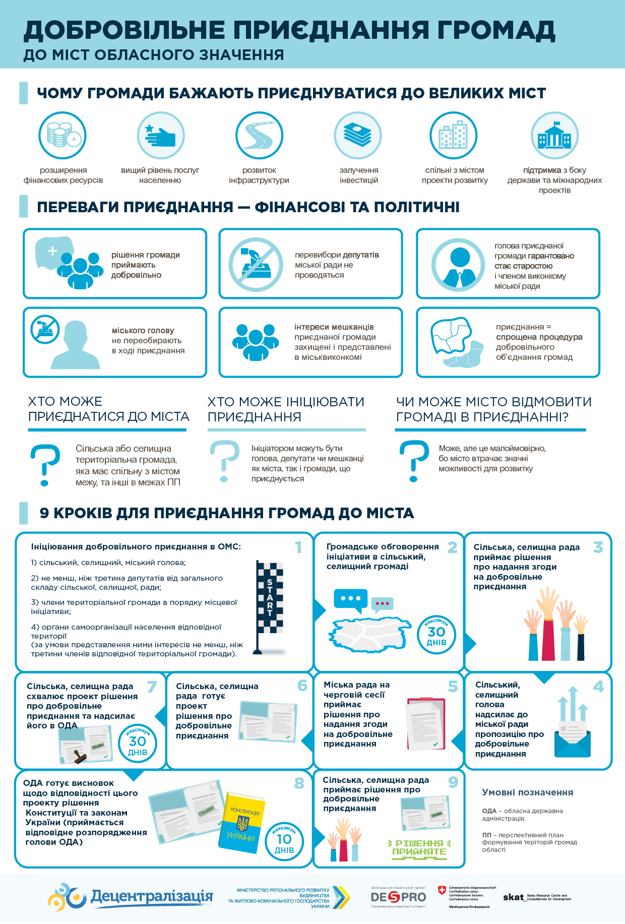 Закон дозволяє містам обласного значення згуртувати навколо себе сусідні сільські та селищні ради і стати центром об’єднаної громади без зайвих бюрократичних процедур – в тому числі, без проведення виборів.