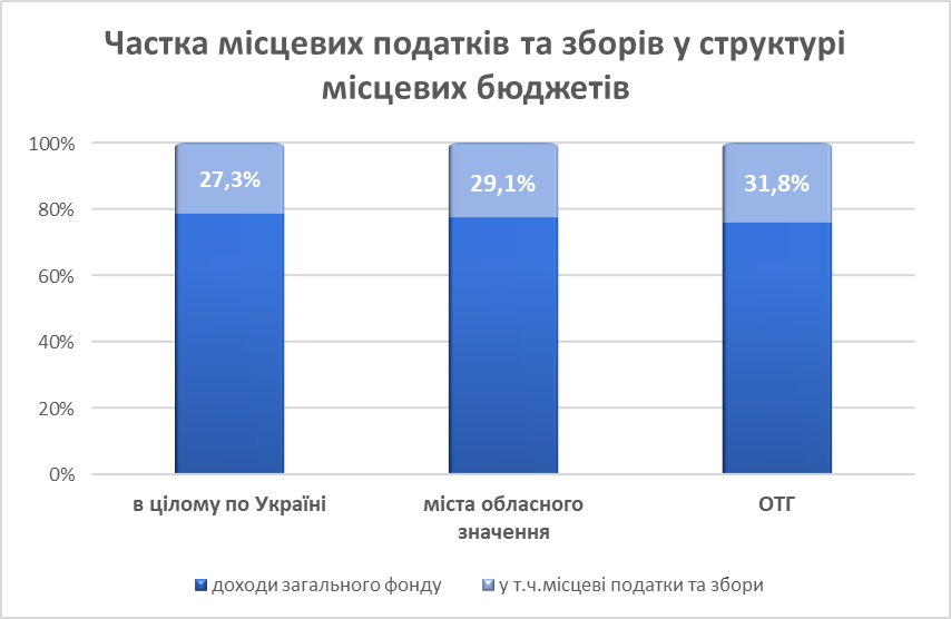 За підсумками 2017 року частка місцевих податків та зборів у структурі власних доходів усіх місцевих бюджетів України склала 27,3%, а бюджети об’єднаних територіальних громад за рахунок місцевих податків і зборів сформували майже 32% дохідної частини своїх бюджетів.