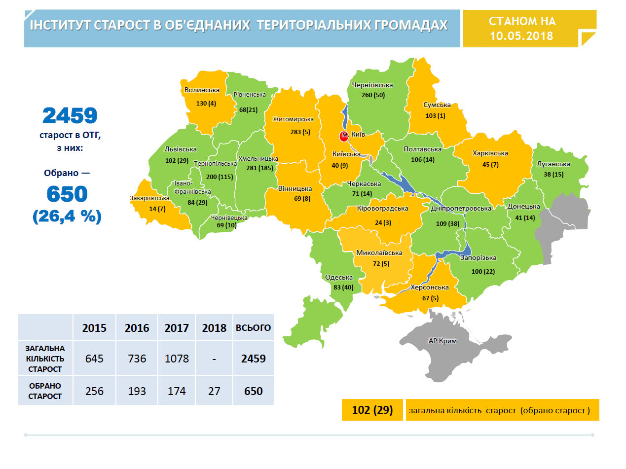 За даними Моніторингу процесу децентралізації та реформування місцевого самоврядування, який щомісяця здійснює Мінрегоін, станом на 10 травня 2018 року в об’єднаних територіальних громадах обрано 650 старост, ще 1809 – виконують обов’язки старост.