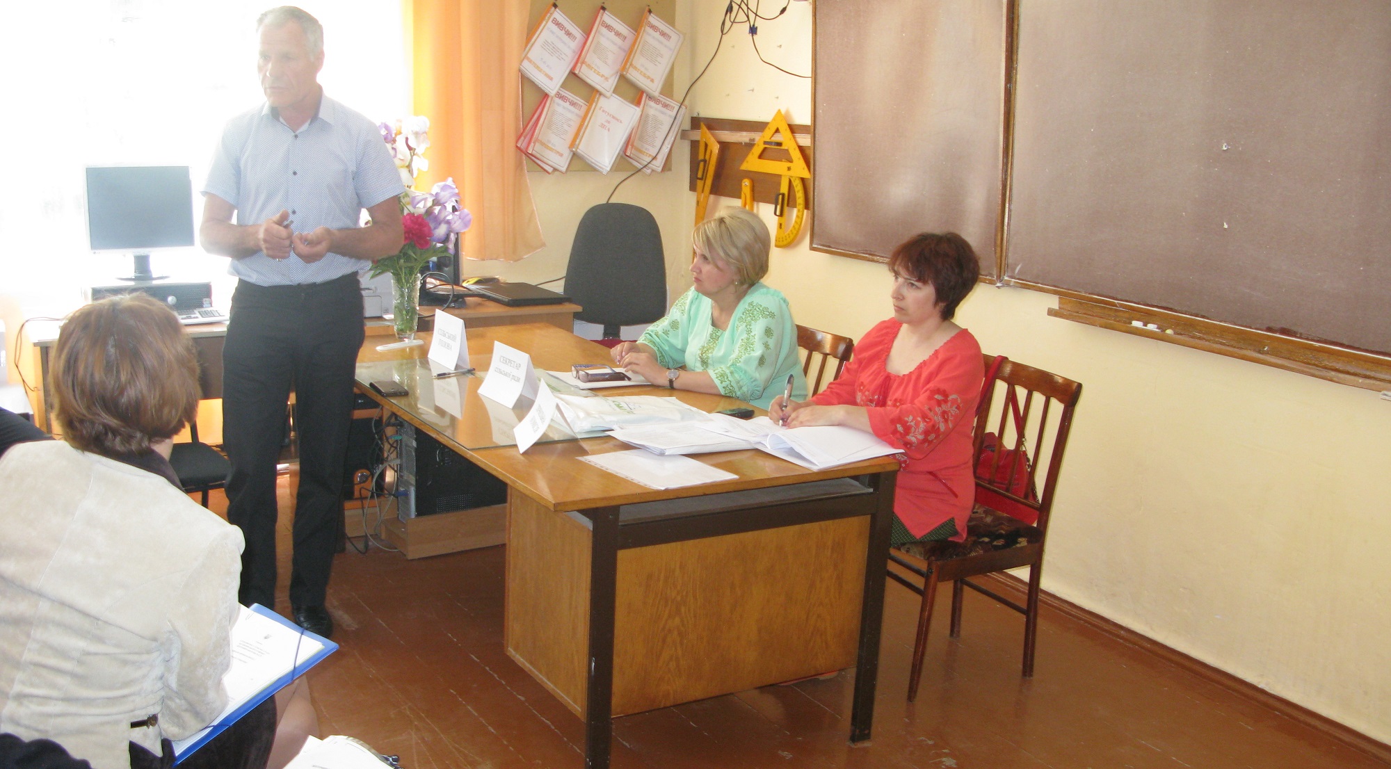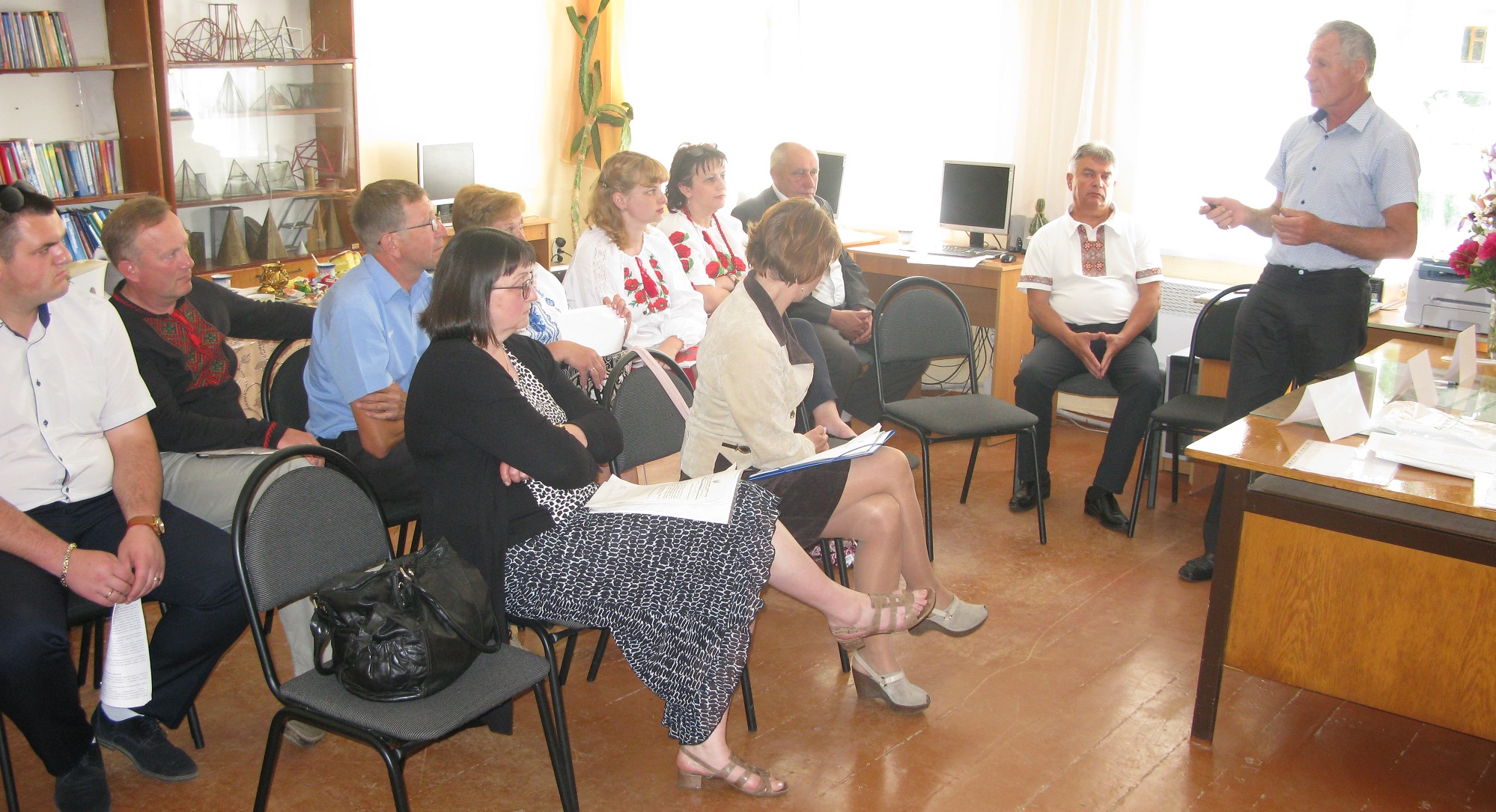 Кабінет математики Великонизгірецької середньої школи, де вже розпочалося виїзне засідання виконкому Семенівської ОТГ. Півтора десятки чоловіків та жінок, більшість з яких у святкових вишиванках, жваво обговорюють сільські проблеми і, піднімаючи руки, голосують за проекти рішень. Найвидатніші математики світу з цікавістю стежать з численних портретів за цими дорослими людьми, які так само, як учні-відмінники, час від часу тягнуть догори руки, неначе хочуть відповідати. На вчительському місці – голова громади Наталія Семенюк, невисока білява жінка із дзвінким командирським голосом. Члени виконкому жваво обговорюють найболючіші проблеми і відразу ж голосують за ті заходи, які мали би вирішити їх.