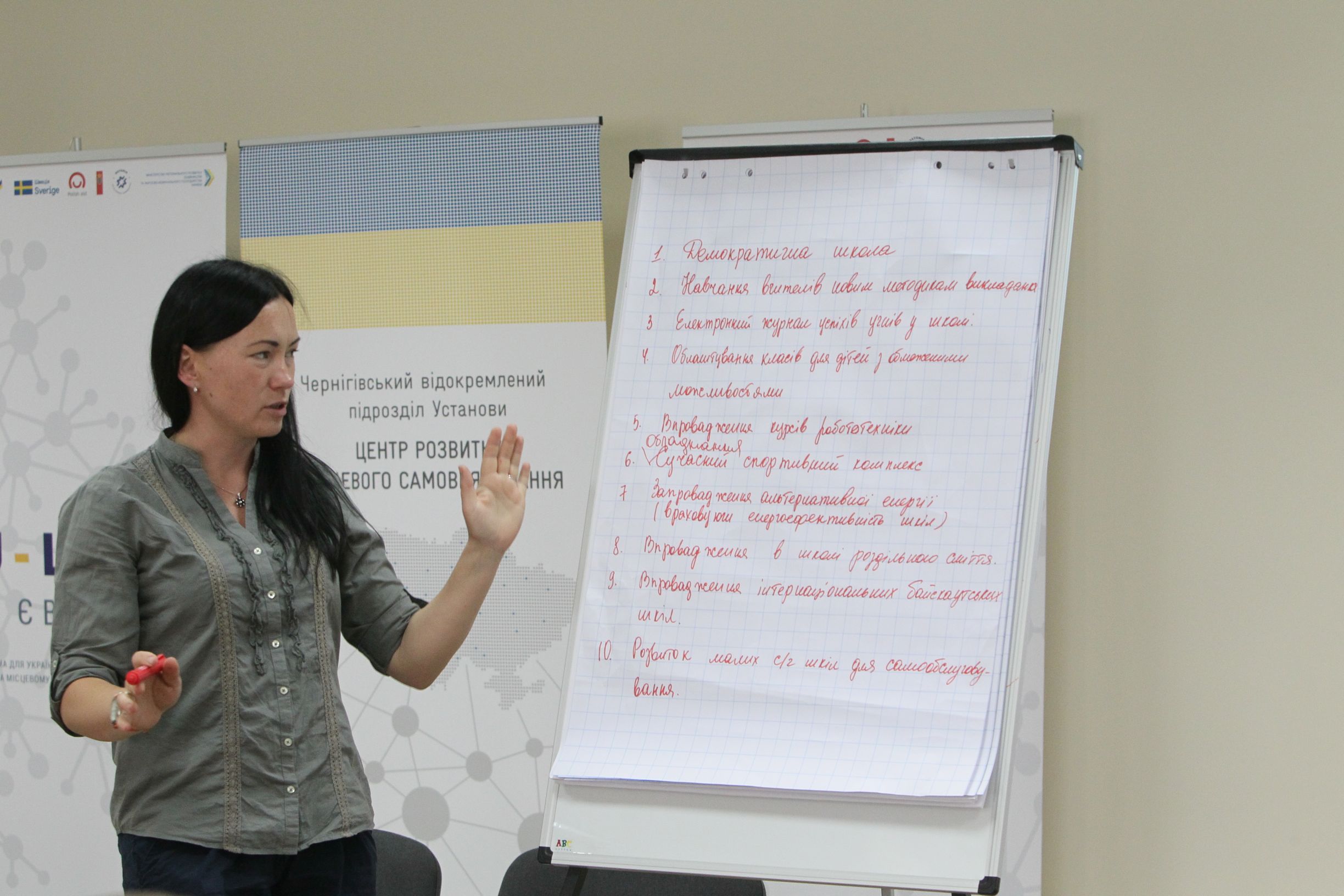 Як зазначила на початку семінару Ірина Кудрик, директор Чернігівського ЦРМС, громада після створення має думати про свій розвиток та залучення інвестиції. І саме для реалізації цих завдань важливо вміти писати проекти та складати заявки. «Наша організація ставить перед собою завдання надати алгоритм підготовки проектів, навчити азам цієї діяльності», - підкреслила вона. За її словами, семінар покликаний допомогти проектним менеджерам громад або спеціалістам, які виконують їхні обов’язки, відпрацювати навички, в першу чергу стосовно тих проектів, що подаються до Міністерства регіонального розвитку, будівництва та ЖКГ України для отримання субвенції на формування інфраструктури.