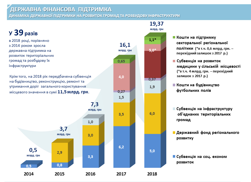 За його словами, від 2014 року і дотепер, державна підтримка на розвиток територіальних громад та розбудову їхньої інфраструктури зросла в 39 разів. «Я думаю, що це дуже промовисті цифри. У 2014 році цифра була півмільярда, зараз – майже двадцять мільярдів гривень. Це є дуже яскрава демонстрація рішучості та ефективності дій держави, влади, Президента, Уряду у напрямку децентралізації»,- сказав Президент.