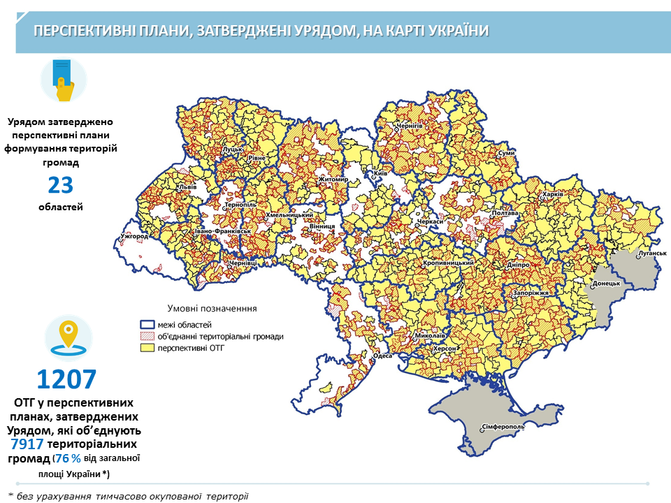 Як відомо, перспективними планами на 100% вже покрита територія Кіровоградської та Рівненської областей. На розгляді центральних органів виконавчої влади - зміни щодо перспективного плану Чернігівської області. Обласні ради Тернопільщини, Херсонщини та Хмельниччини прийняли зміни до перспективних планів, які тепер покривають усю територію цих регіонів. Донецька та Луганська області, де зараз нема обласних рад, мають перспективні плани на усю територію, затверджені обласними адмінстраціями.