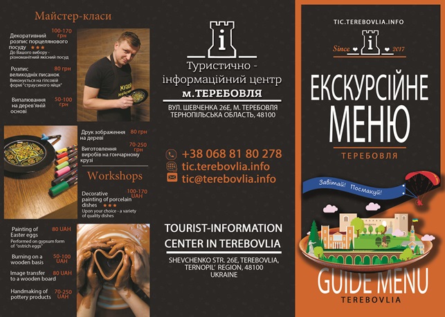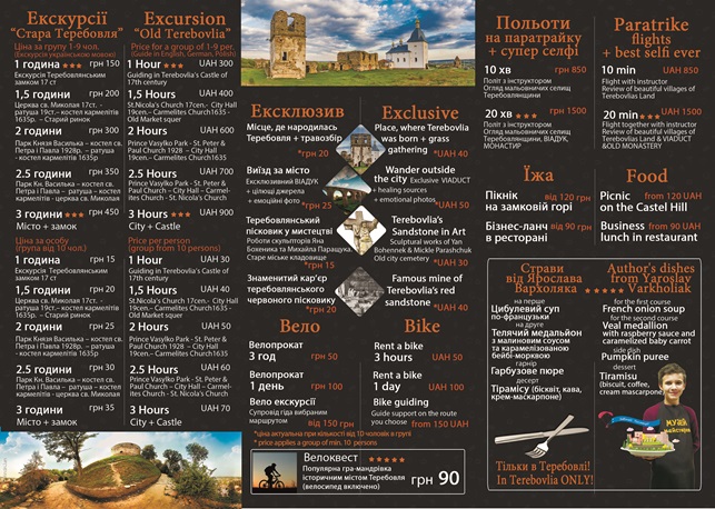 В “Екскурсійному меню Теребовлі” чітко представленні наші пропозиції: історичні прогулянки старим містом, околицями Теребовлі, велоекскурсії, польоти на паратрайку, організація пікніку на замковій горі і звичайно ж майстер-класи від музею-майстерні у Теребовлі. І все це – з актуальними цінами та професійним багатомовним супроводом гідів.