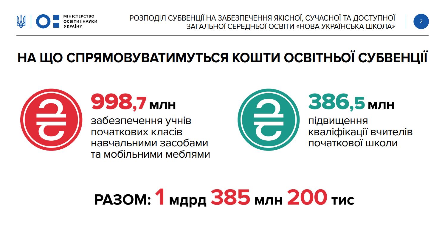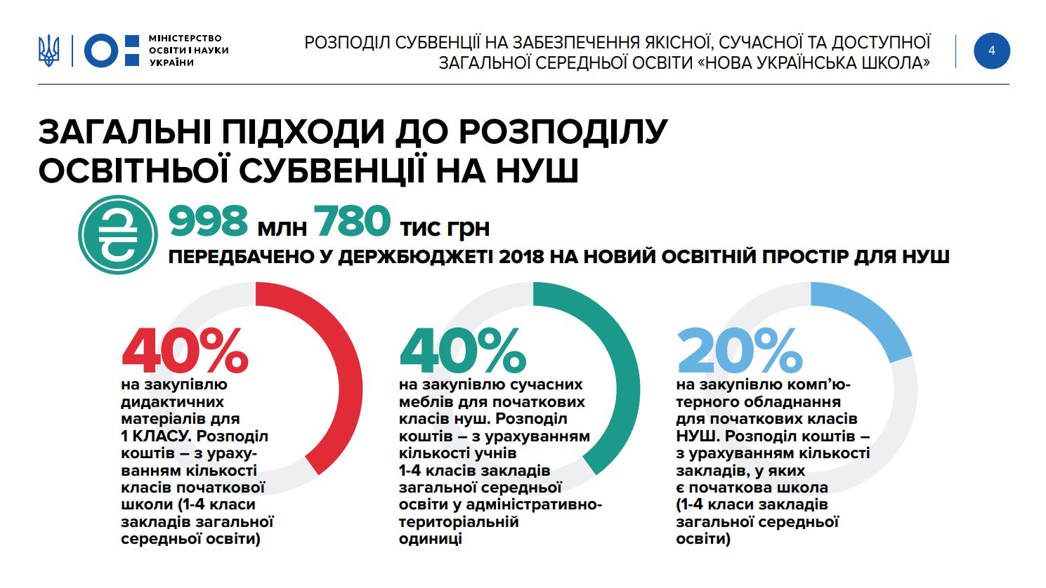 • 40% цих грошей буде спрямовано на закупівлю дидактичних матеріалів для 1-го класу. Розподіл коштів між областями здійснюватиметься з урахуванням кількості класів початкової школи в регіоні.