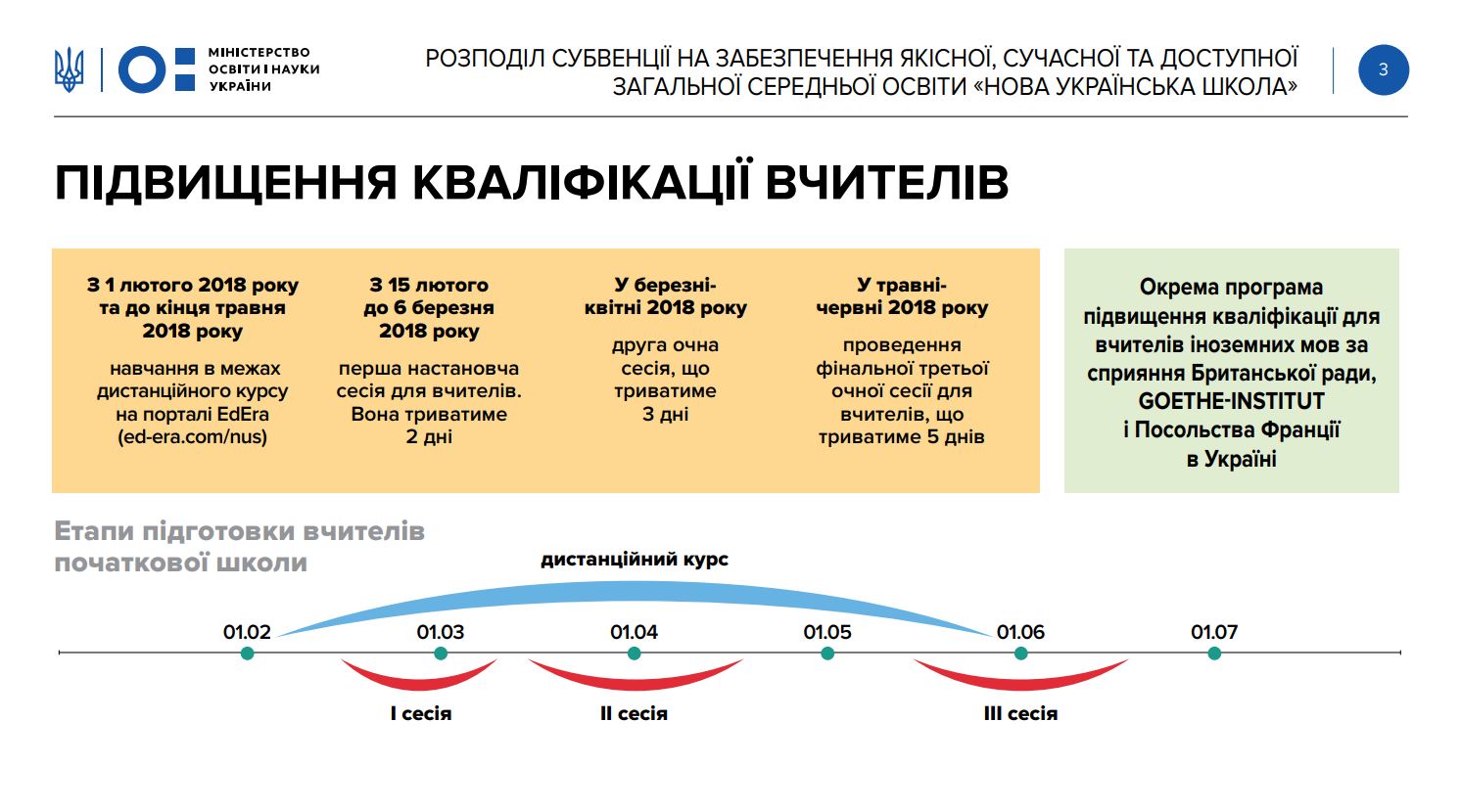 Вона додала, що наразі вже запущено та триває процес підвищення кваліфікації вчителів. 1 лютого розпочалося навчання на дистанційному курсі. І хоча цей курс обов‘язково мають пройти тільки 22 тис вчителів, сьогодні вже його проходить більше ста тисяч слухачів. Також тривають очні сесії, на яких вчителі можуть закріпити отримані знання.