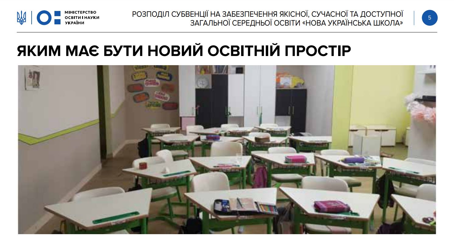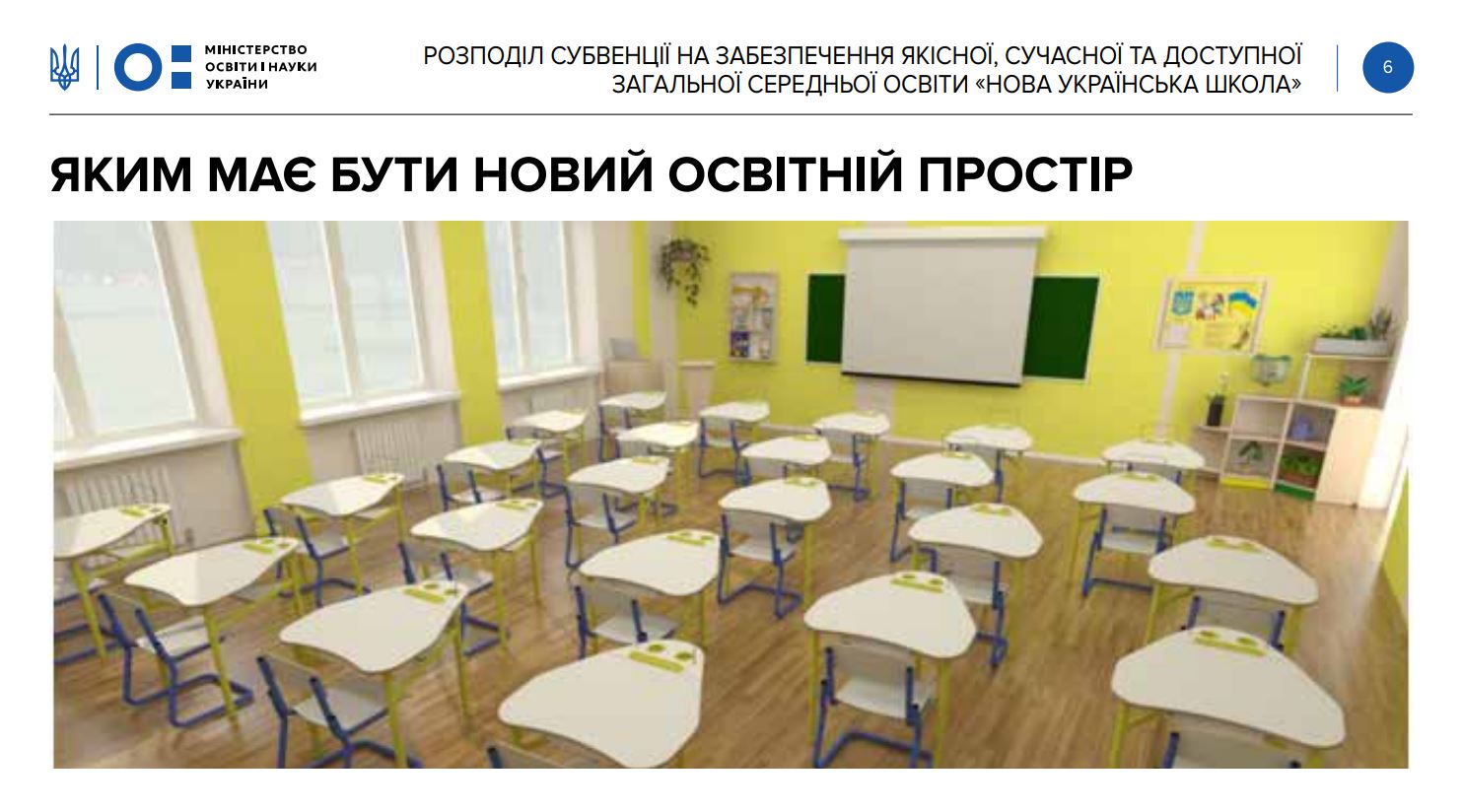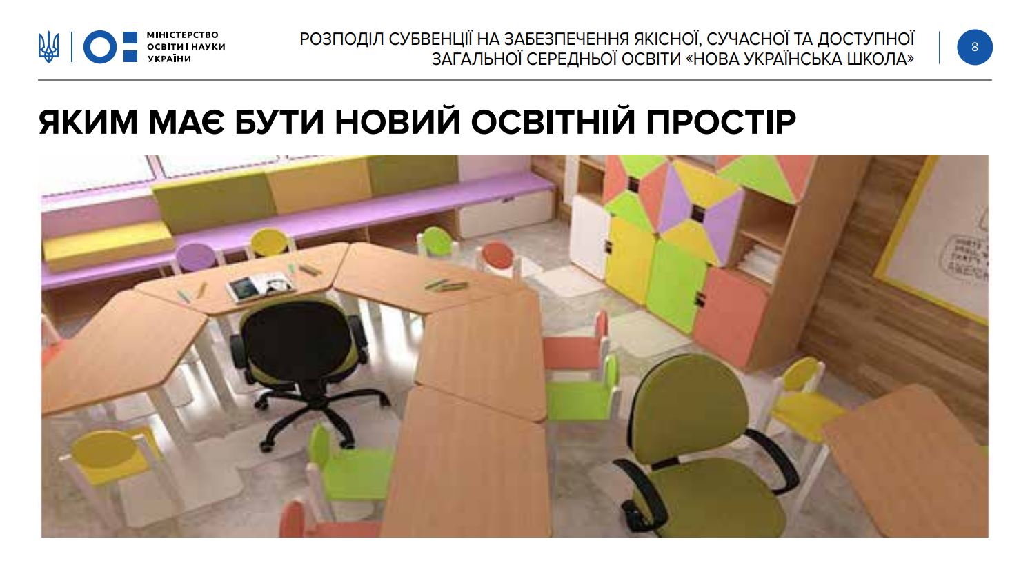 • 40% коштів буде спрямовано на закупівлю сучасних меблів для початкових класів НУШ. Розподіл між областями здійснюватиметься з урахуванням кількості учнів 1-4-го класів у певній місцевості.