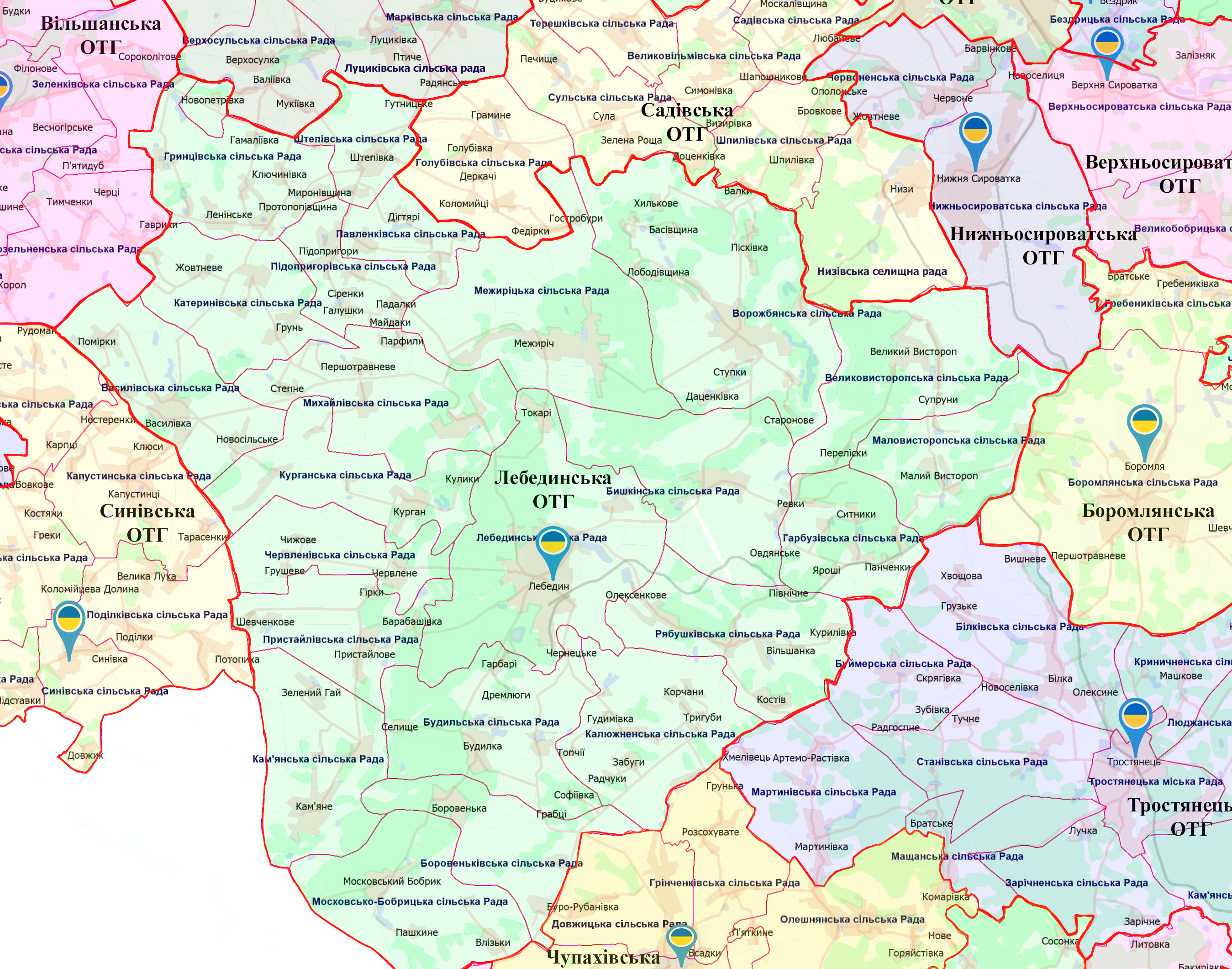 Фактично весь Лебединський район (за винятком Голубівської сільської ради, яка територіально і логістично знаходиться ближче до обласного центру – м. Суми) має стати однією громадою. Така ситуація пов’язана з тим, що Лебедин знаходиться в центрі району і іншого населеного пункту, на базі якого можна було б створити спроможну громаду, в районі немає.