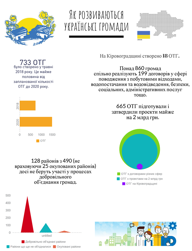 Від початку процесу децентралізації в Україні було утворено 733 ОТГ. Це майже половина від запланованої кількості. Процес об’єднання громад має завершитись до 2020 року. На Кіровоградщині сьогодні діє 18 ОТГ. Першою серед них стала Маловисківська об’єднана територіальна громада, створена 14 серпня 2015 року. Очолив її Юрій Гульдас.