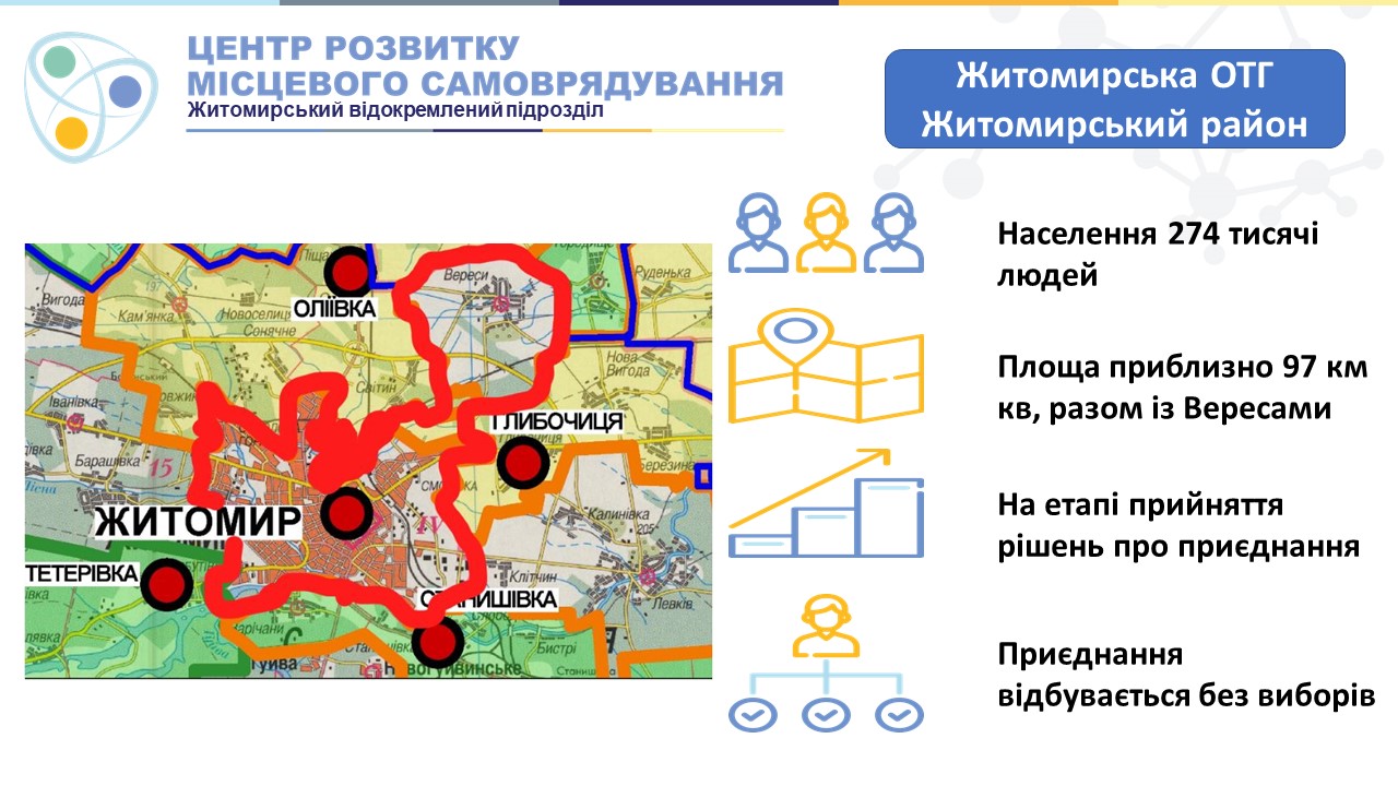 «Крім того, 26 липня Житомирська міська рада розпочала процес приєднання села Вереси, таким чином ставши першим обласним центром в Україні, який перейшов від обговорення можливості створення ОТГ до об’єднання», - підсумував Василь Невмержицький.
