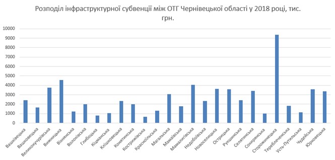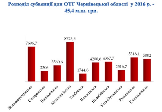 У перший бюджетний рік існування об’єднаних територіальних громад в Україні – 2016, з Державного бюджету громадам на розвиток інфраструктури було передбачено субвенцію у розмірі 1 млрд грн. Кошти субвенції розподілилися між 159 об’єднаними громадами за чіткою формулою: в залежності від кількості сільського населення і площі громади. Чернівецька область, незважаючи на те, що є найменшою як за площею, так і за населенням, стала восьмою за обсягами фінансування, залучивши більше 45 млн грн на інфраструктуру ОТГ. Не в останню чергу це відбулося за рахунок потужного першого об’єднання – більше 10 громад в 2015 році було утворено лише в п’яти областях України.