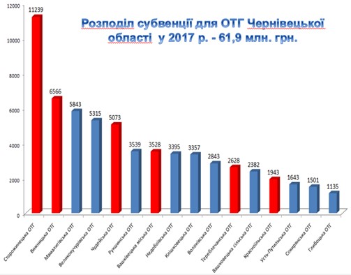 У 2017 році субвенція на формування інфраструктури 366 створених у 2015-2016 рр. об’єднаних територіальних громад становила 1,5 млрд грн. Чернівецька область отримала коштів на інфраструктурну субвенцію майже в півтора рази більше, ніж у попередньому – 61,9 млн грн, проте через зростання кількості громад та утворення двух потужних громад на базі м. Сторожинець та м. Вижниця, які об’єднали велику кількість великих населених пунктів навколо себе, громади, утворені у 2015 році, отримали у 2017 меншу суму коштів. Розподіл субвенції для громад Чернівецької області наведено нижче (синій колір – ОТГ утворені в 2015 р., червоний – 2016 р.).