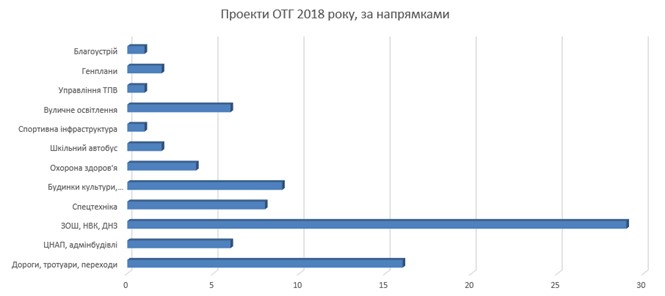 Всього громадами було подано 82 проекти, з них майже чверть – це проекти Сторожинецької ОТГ (21), в якій намагалися охопити всі населені пункти. Найбільш популярними виявилися об’єкти, пов’язані з об’єктами освіти (школами та дитячими садками) та покращенням якості доріг у громадах. З точки зору обсягів фінансування освітні об’єкти (школи та дитячі садки) забрали на себе майже третину інфраструктурних коштів – 19,3 млн грн, майже 13 млн грн також пішло на дороги та тротуари. Слід відмітити суттєве зростання минулого року обсягів коштів, які виділялися громадами на придбання спецтехніки – 9,1 млн грн.