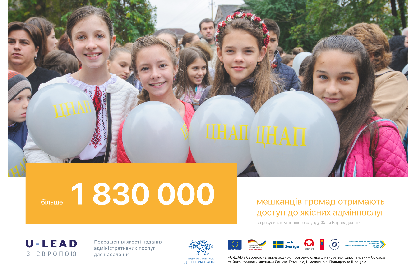 Більше 1 830 000 мешканців громад отримають доступ до якісних адмінпослуг в результаті реалізації першого Раунду Фази впровадження напряму з покращення якості надання адміністративних послуг для населення Програми “U-LEAD з Європою”.
