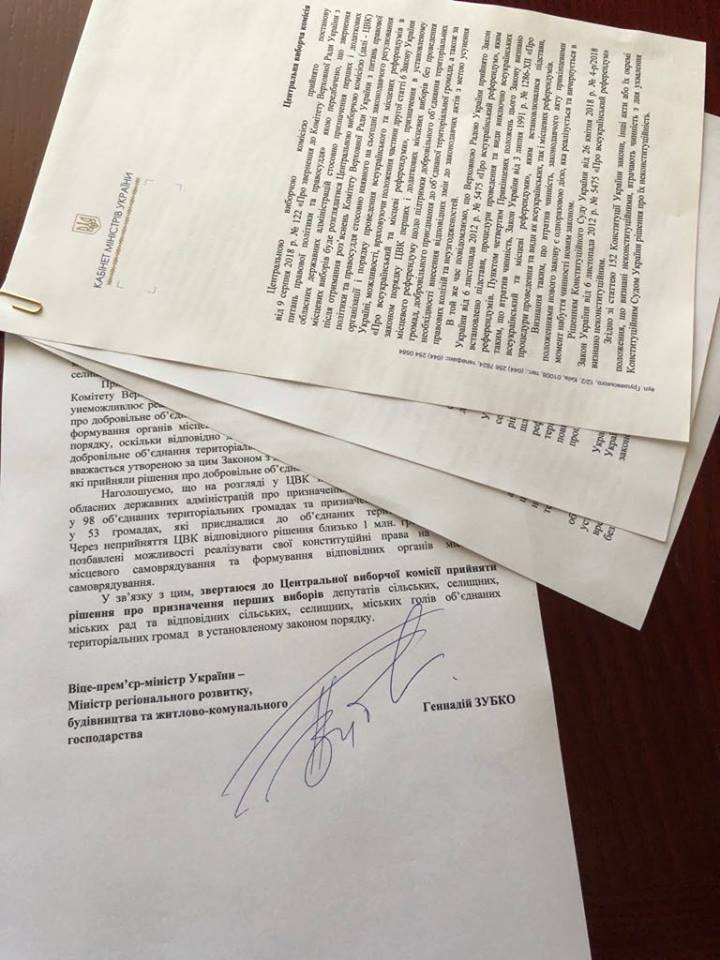 Віце-прем’єр-міністр – Міністр регіонального розвитку, будівництва та ЖКГ Геннадій Зубко в офіційному листі до ЦВК обґрунтував, чому виборив об'єднаних громадах можна призначати.