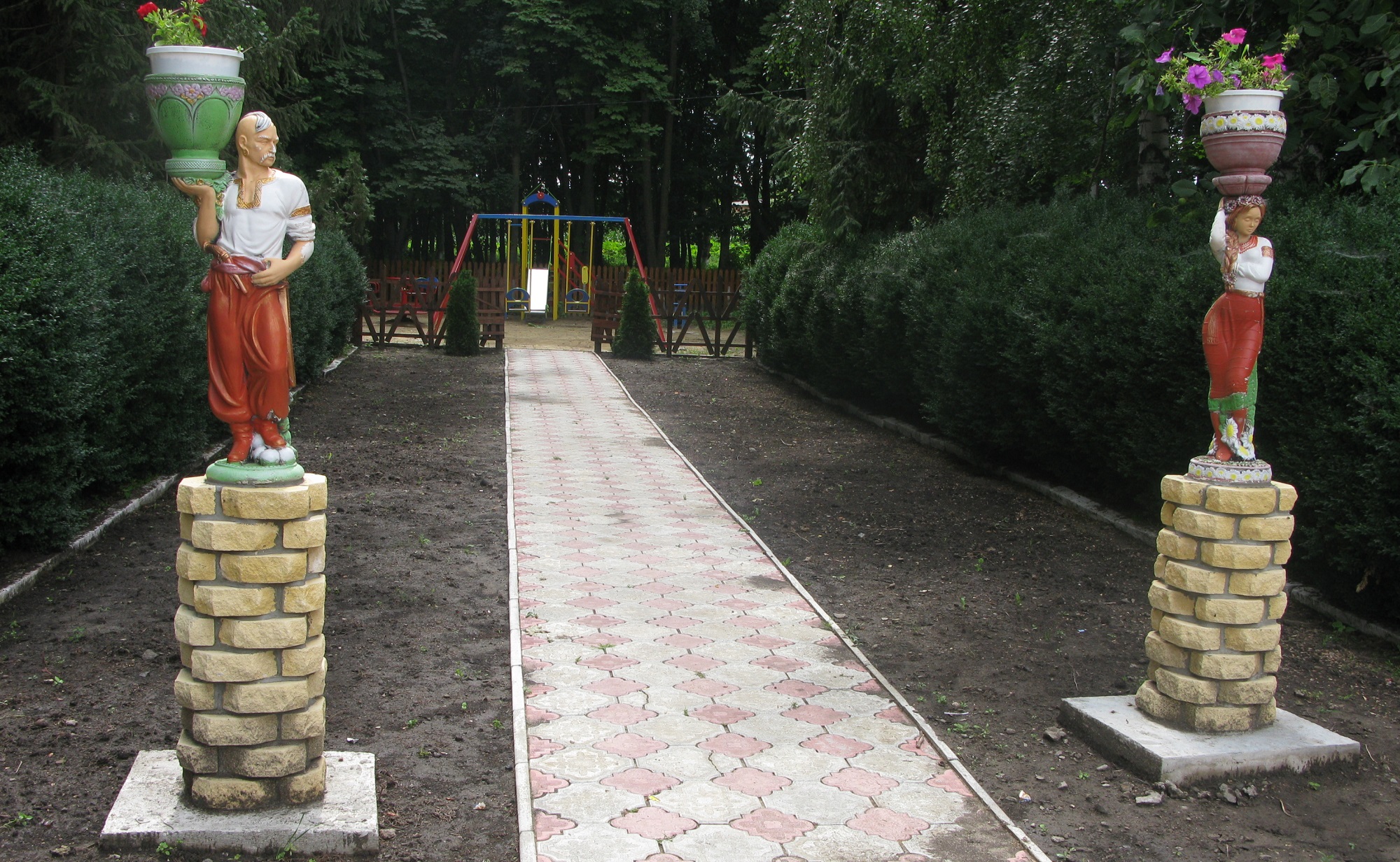 Дитячий майданчик та кам’яні статуї козака і козачки
