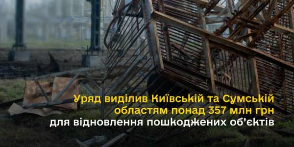 Уряд виділив Київській та Сумській областям понад 357 млн грн для відновлення пошкоджених об’єктів